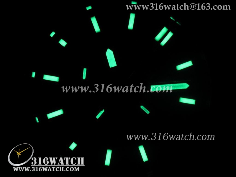 黑色表盘,,红白两色相间夜光时间标记,红色指针上涂有白色夜光材质