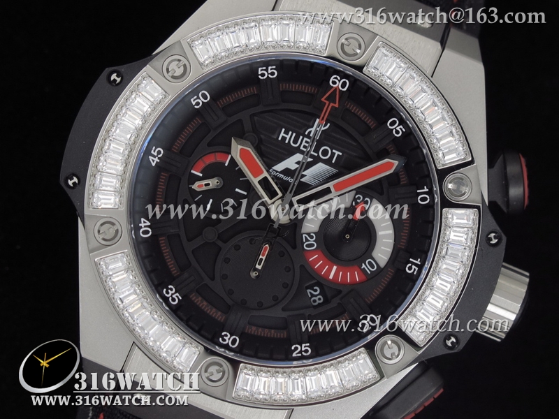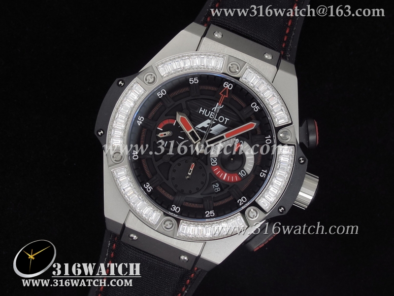 高仿宇舶Hublot-大爆炸King Power 48MM系列F1 镶钻边框 黑色表盘 黑色尼龙表带 亚洲计时7750机芯 HB0015