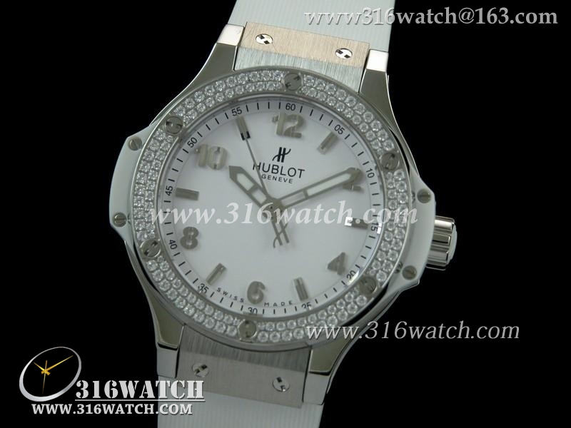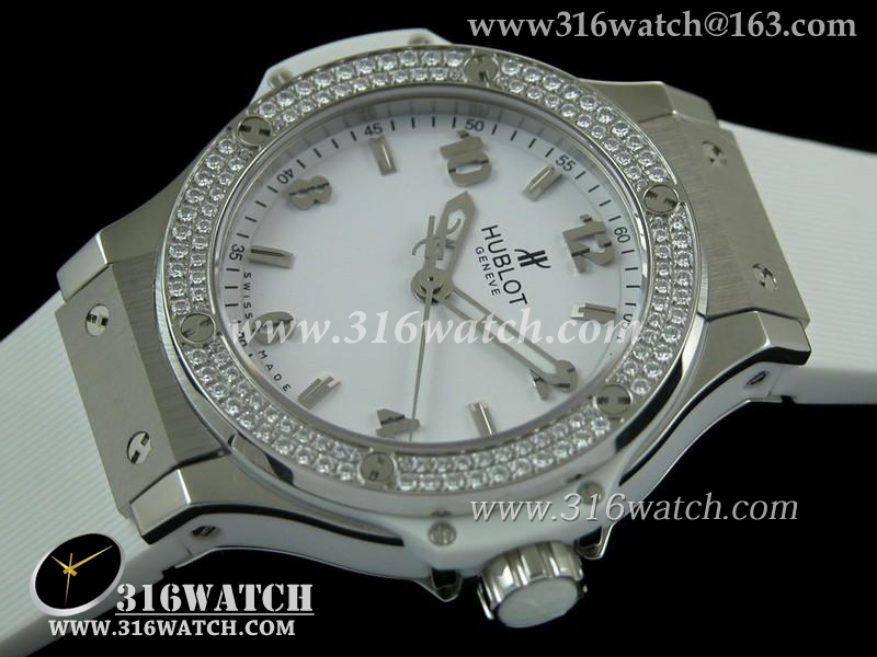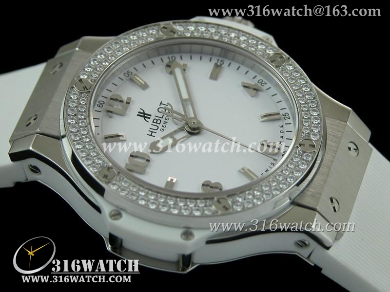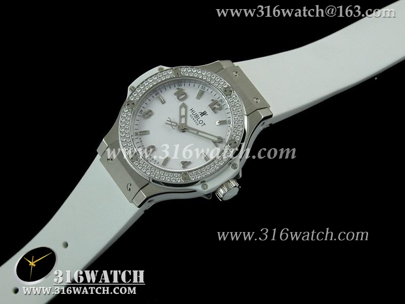 精仿宇舶Hublot-大爆炸经典融合38mm系列 白色表盘 镶钻边框 黑色橡胶表带 女士瑞士石英手表 HB0149