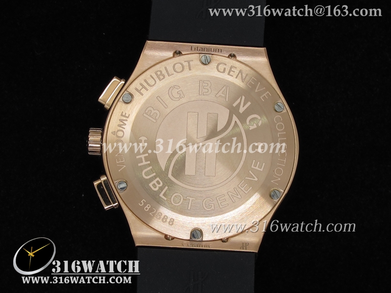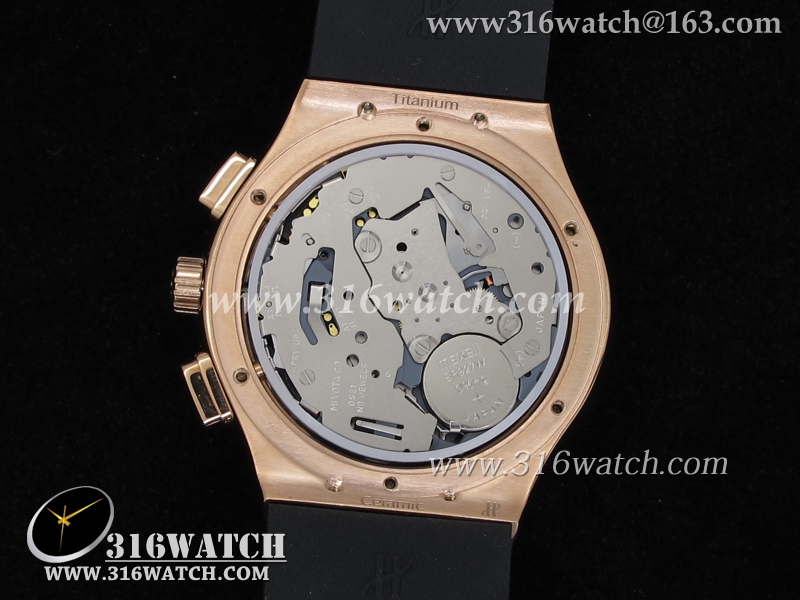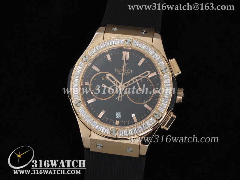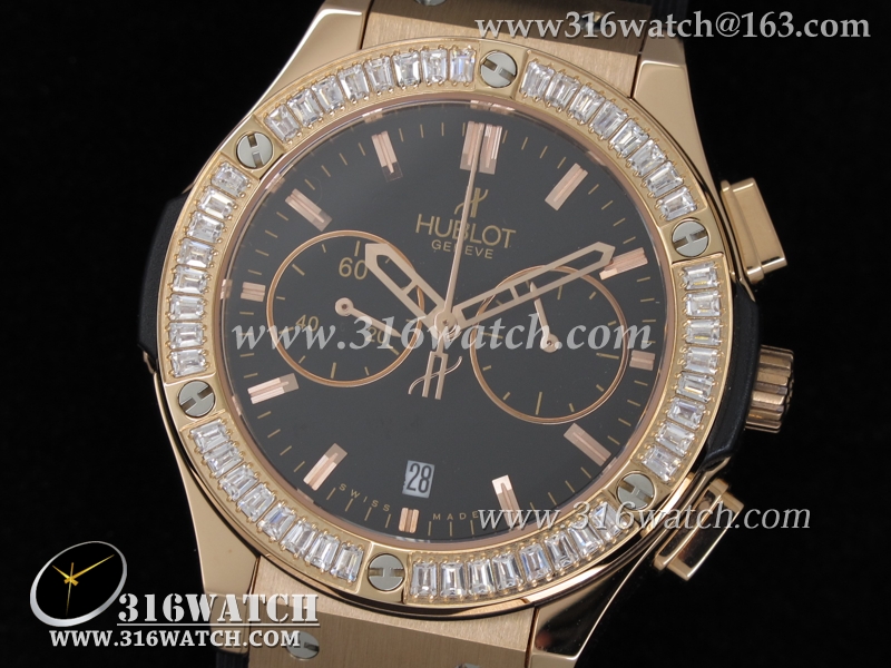 高仿宇舶Hublot-大爆炸经典融合40mm系列 18k玫瑰金电镀表壳 镶钻边框 黑面黑色橡胶带 中式计时石英表 HB0052