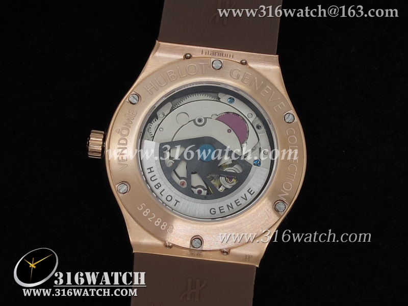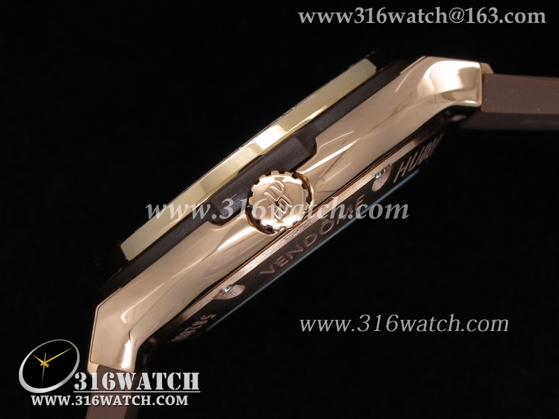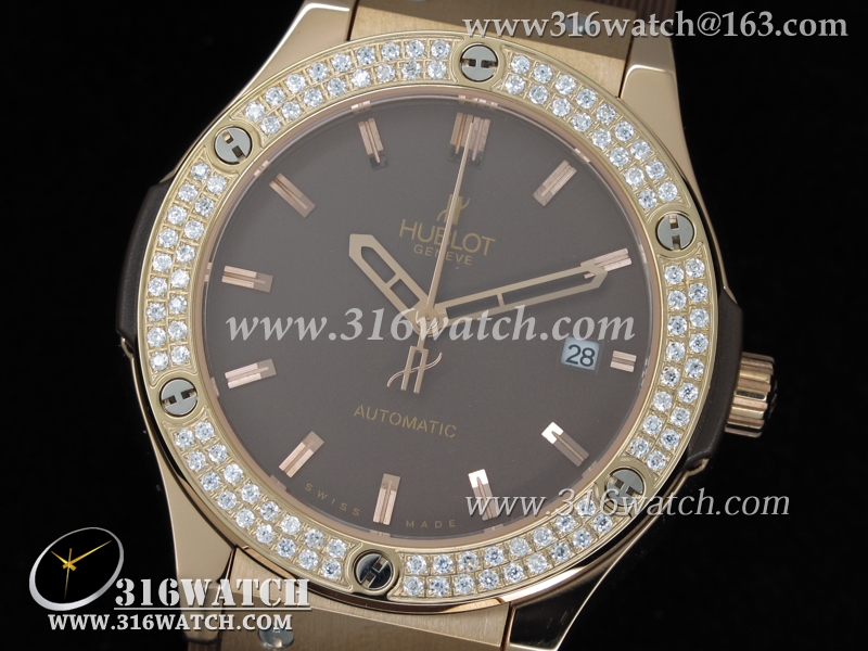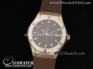 高仿宇舶Hublot-大爆炸经典融合38mm系列 18k玫瑰金电镀表壳 镶钻边框 咖啡色表盘 女士自动机械表 HB0045