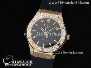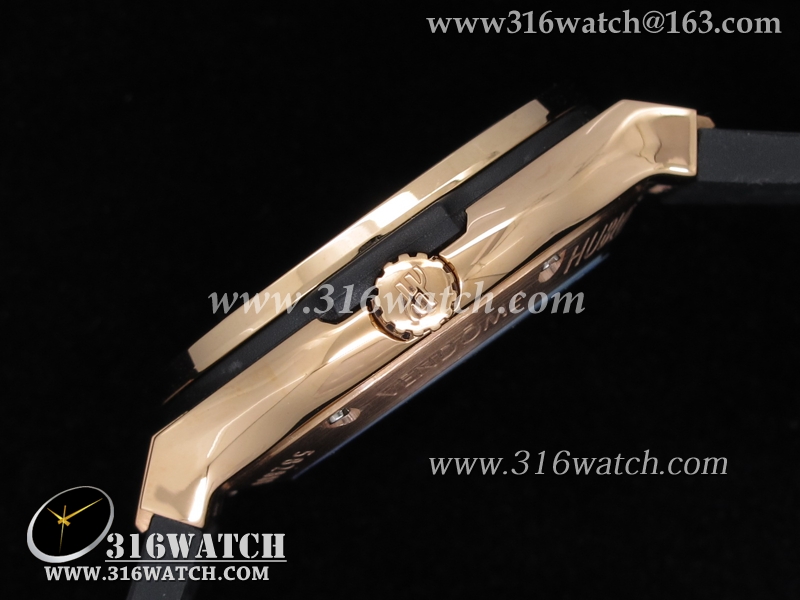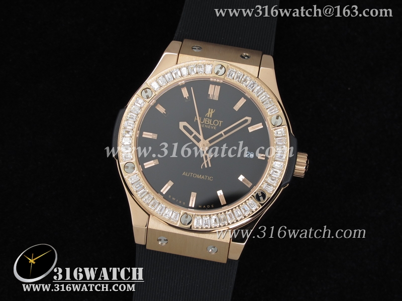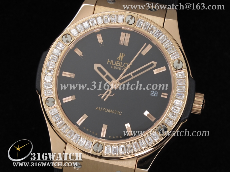 高仿宇舶Hublot-大爆炸经典融合38mm系列 18k玫瑰金电镀表壳 镶钻边框 黑色表盘 女士自动机械表 HB0044