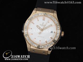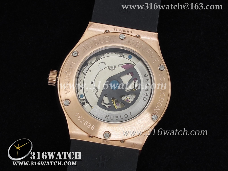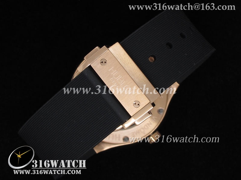 高仿宇舶Hublot-大爆炸经典融合38mm系列 18k玫瑰金电镀表壳 镶钻边框 黑色橡胶带 女士自动机械表 HB0043