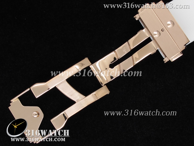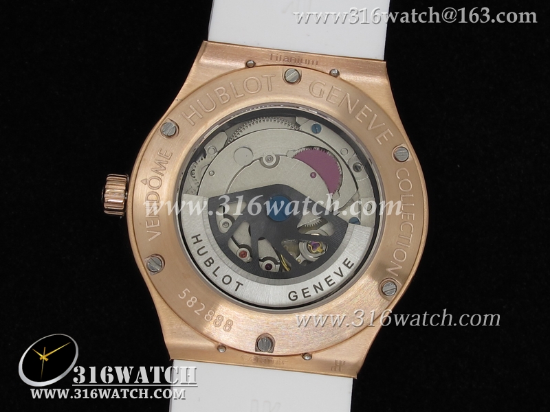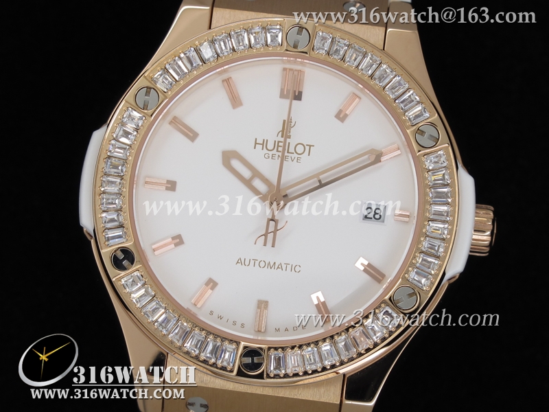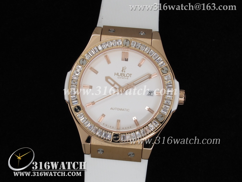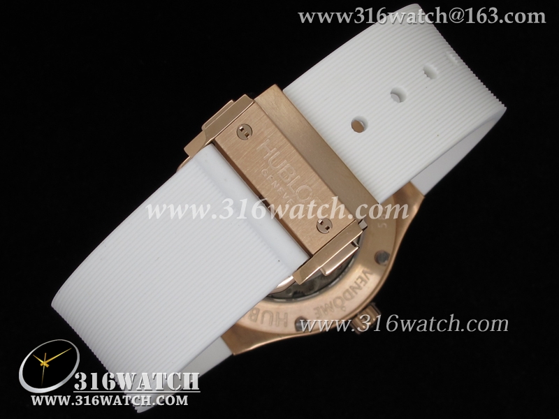 高仿宇舶Hublot-大爆炸经典融合38mm系列 18k玫瑰金电镀表壳 镶钻边框 白色橡胶带 女士自动机械表 HB0042