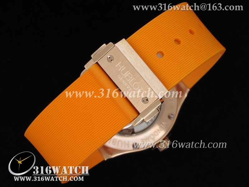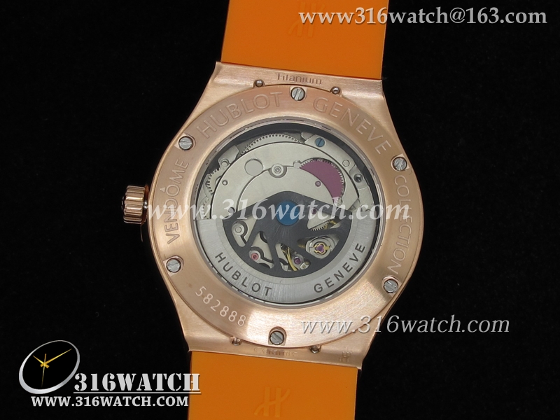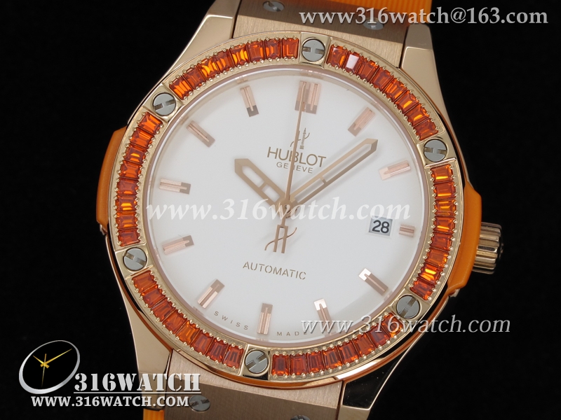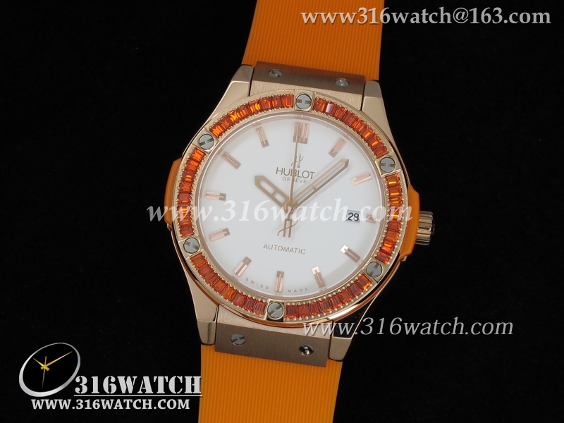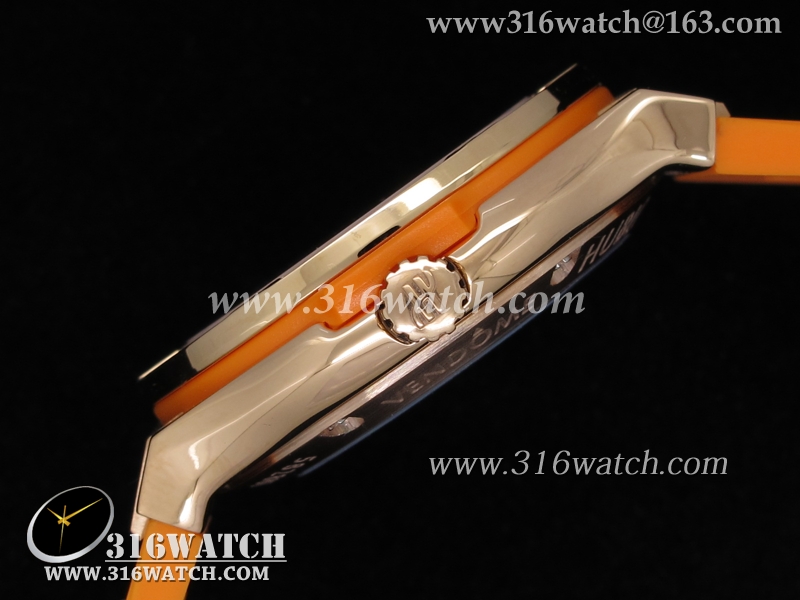 高仿宇舶Hublot-大爆炸经典融合38mm系列 18k玫瑰金电镀表壳 镶钻边框 橙色橡胶带 女士自动机械表 HB0041
