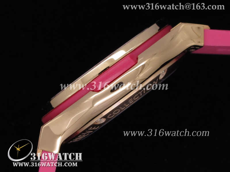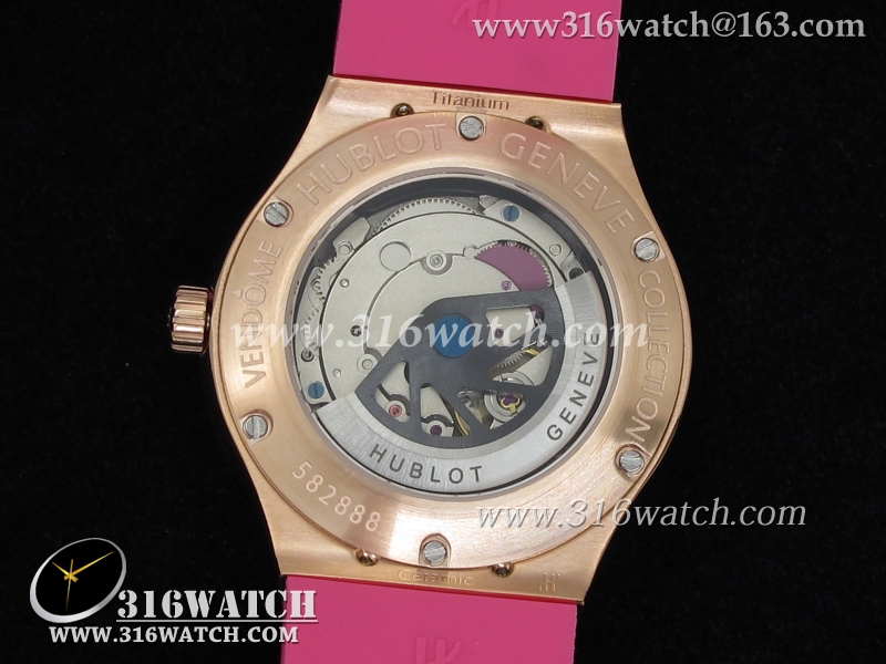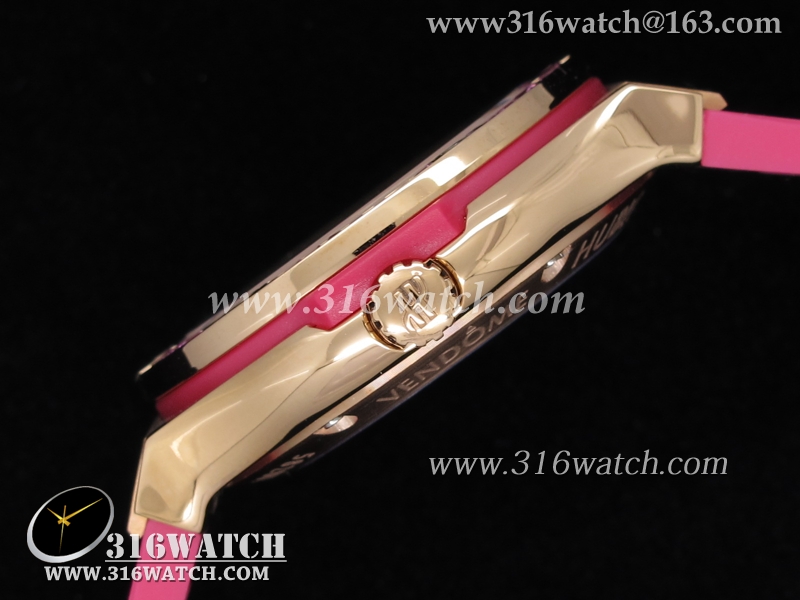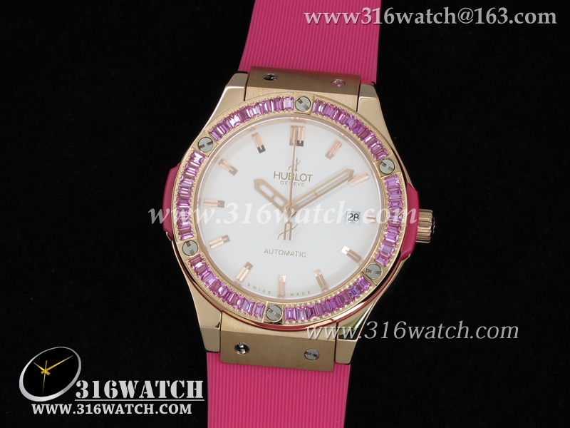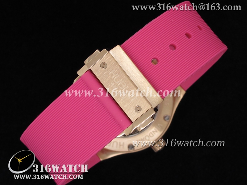 高仿宇舶Hublot-大爆炸经典融合38mm系列 18k玫瑰金电镀表壳 镶钻边框 粉红色橡胶带 女士自动机械表 HB0039