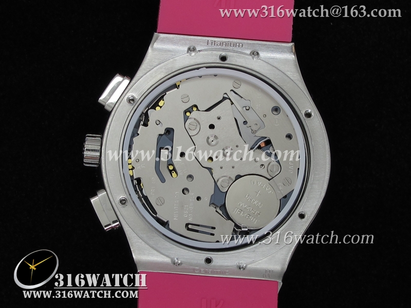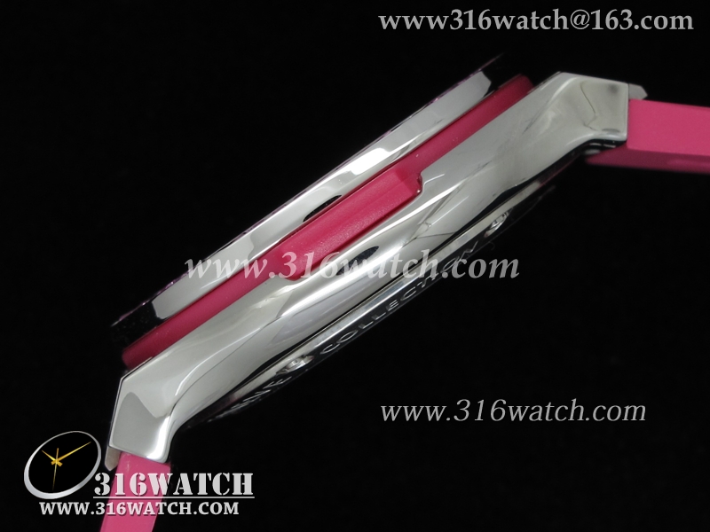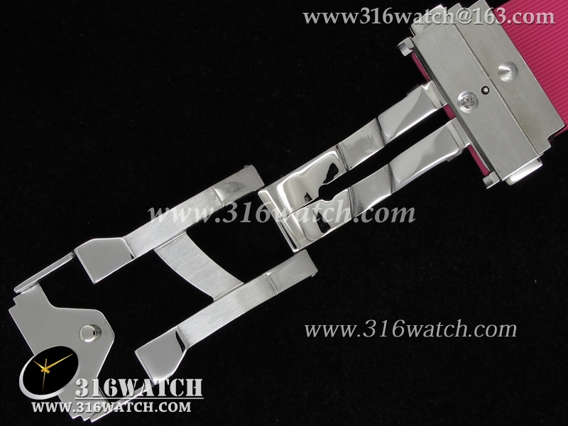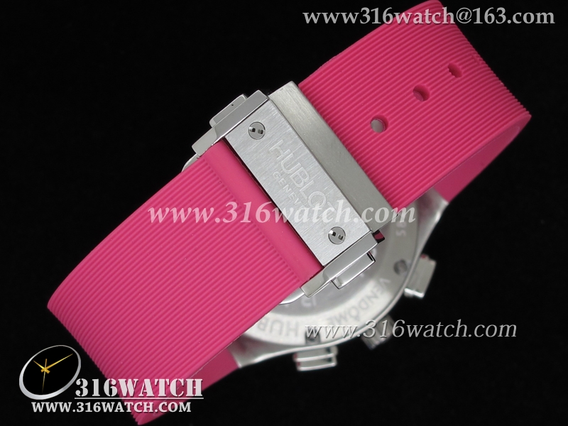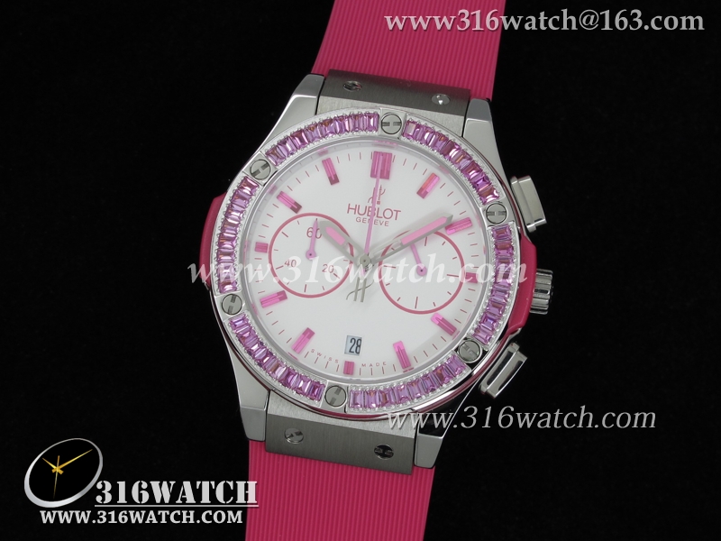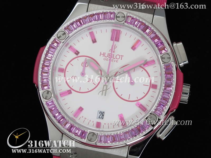 高仿宇舶Hublot-大爆炸经典融38mm系列 镶钻边框 白色表盘 粉红色橡胶带 女士计时石英表 HB0034