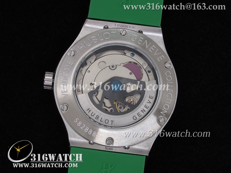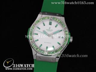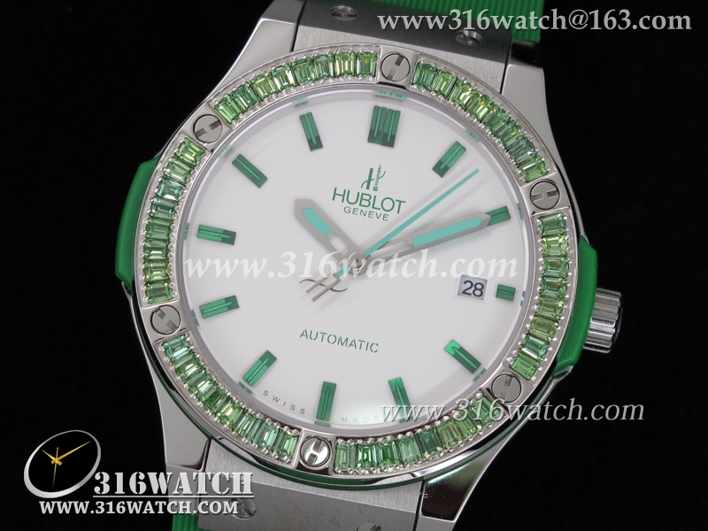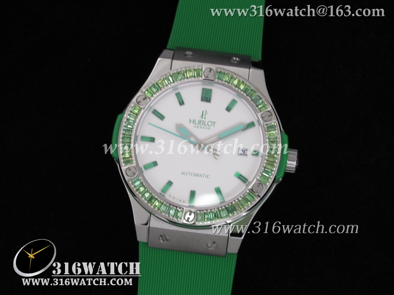 高仿宇舶Hublot-大爆炸经典融合38mm系列 绿色镶钻边框 白色表盘 绿色橡胶带 女士自动机械表 HB0030