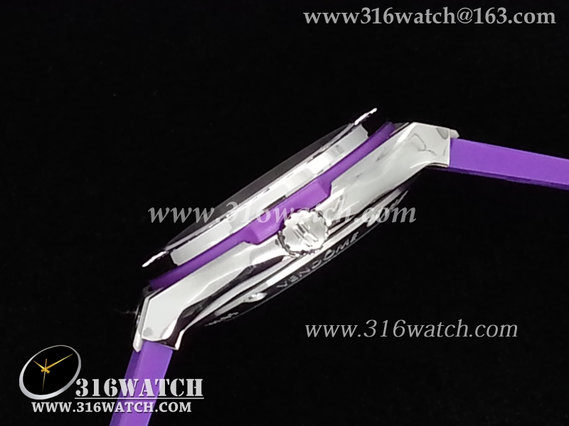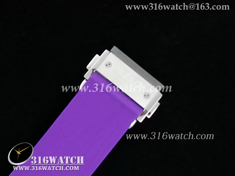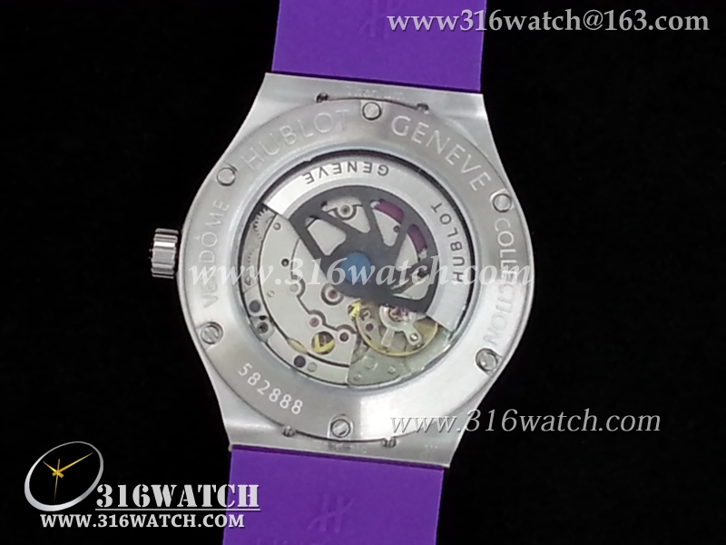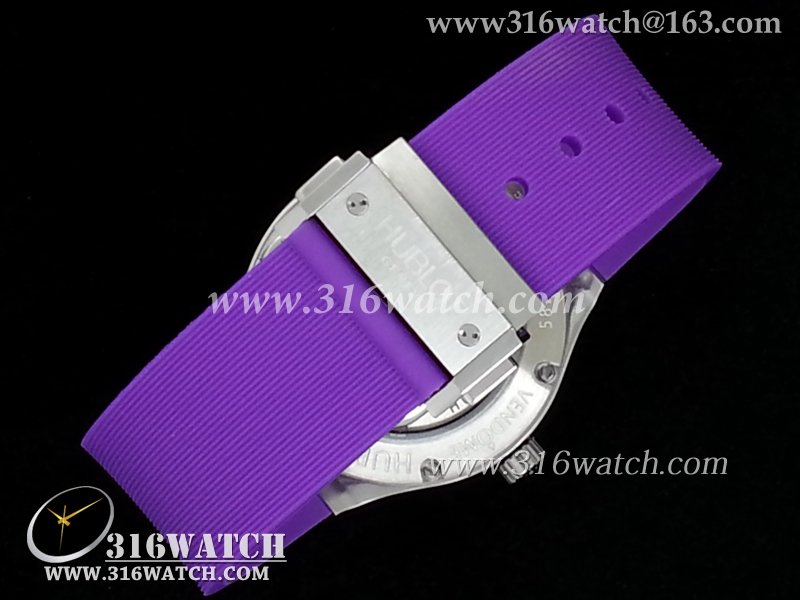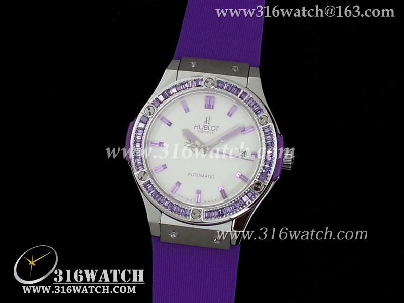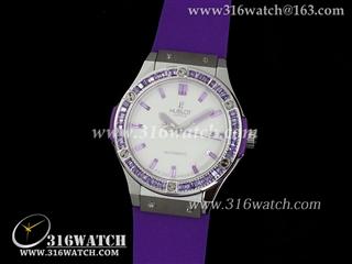 高仿宇舶Hublot-大爆炸经典融合38mm系列 紫色镶钻边框 白色表盘 紫色橡胶带 女士自动机械表 HB0028