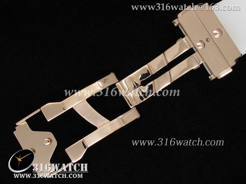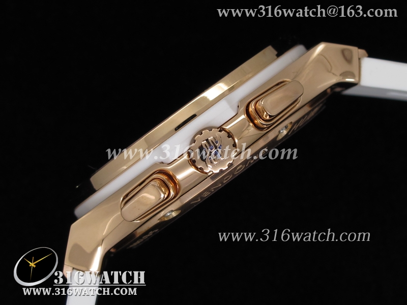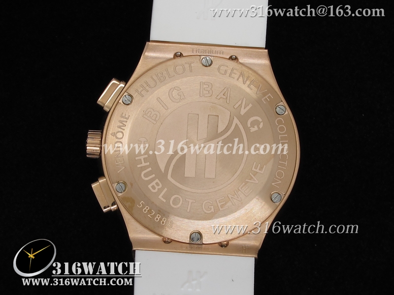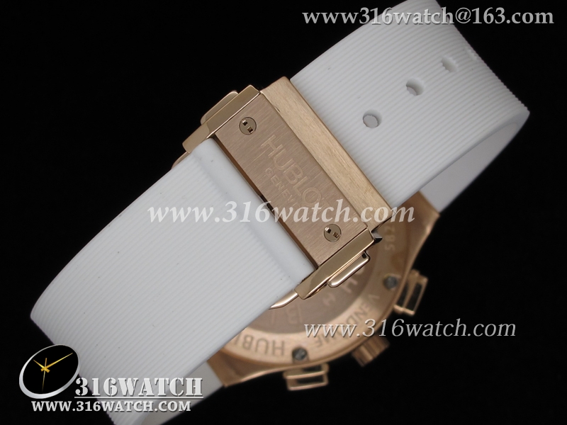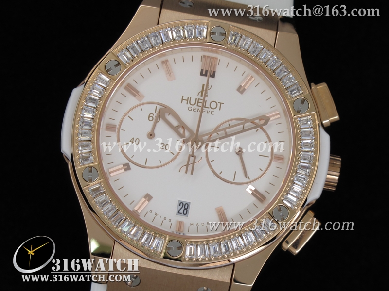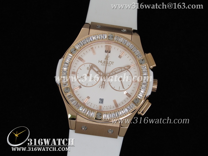 高仿宇舶Hublot-大爆炸经典融合40mm系列 18k玫瑰金电镀表壳 镶钻边框 白面白色橡胶带 中式计时石英表 HB0054