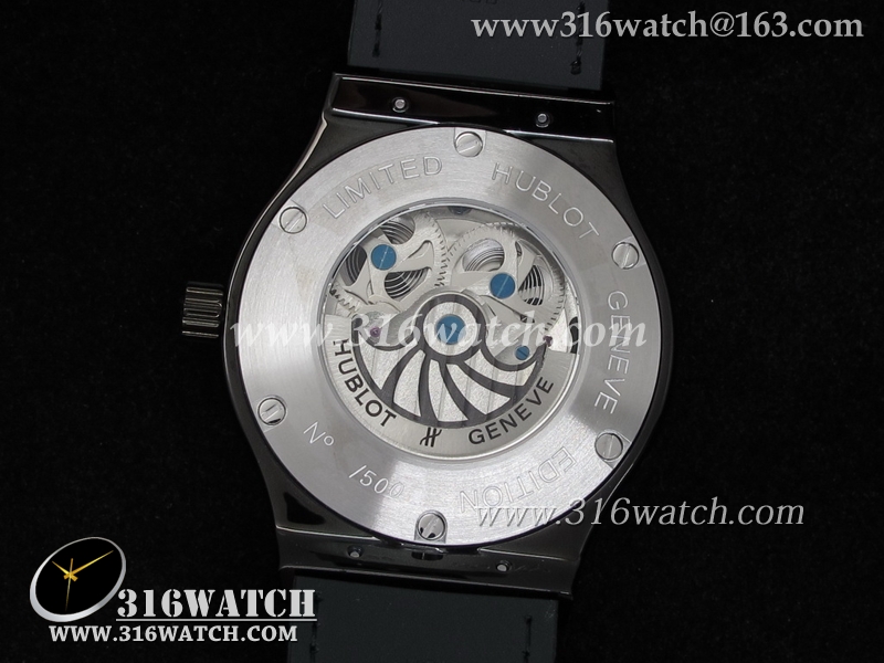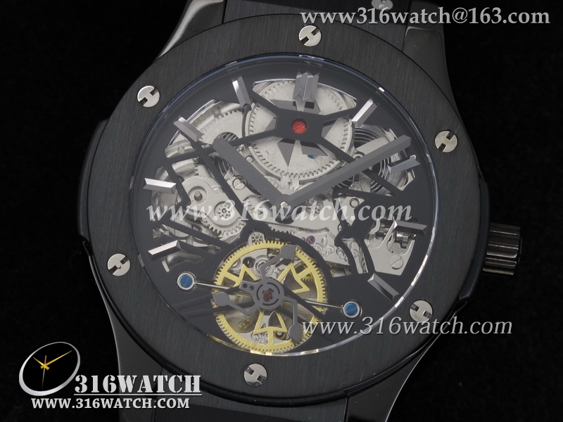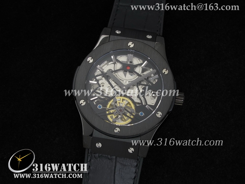 高仿宇舶Hublot-大爆炸经典融合44mm系列 黑色PVD壳 骨架飞轮表盘 黑色皮带 男士自动机械表 HB0090