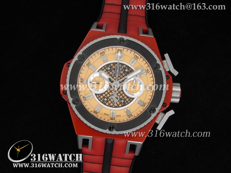高仿宇舶Hublot-大爆炸限量版系列 国王权力法拉利限量版 玫瑰金色表盘 红色/黑色橡胶表带 亚洲7750计时机械表 HB0077