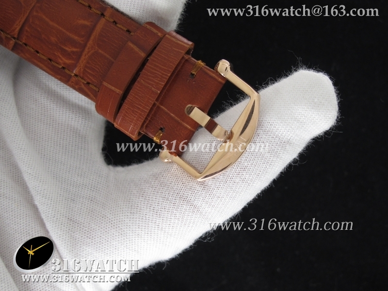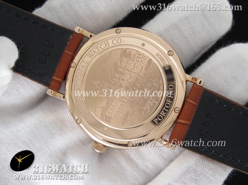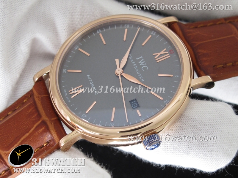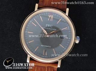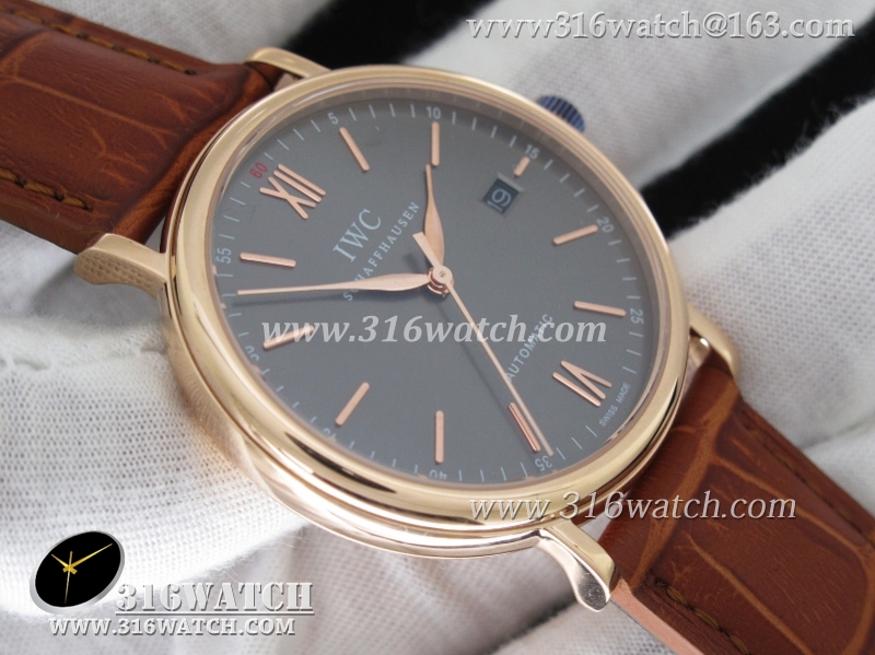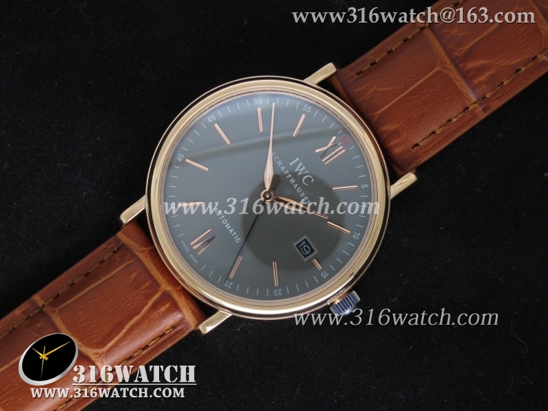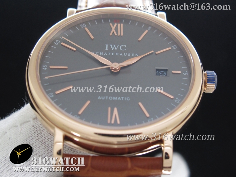 万国IWC-柏涛菲诺系列 18k玫瑰金电镀表壳 灰色表盘 棕色牛皮带 仿瑞士ETA-2824机芯 高仿1:1万国手表 IWC0095