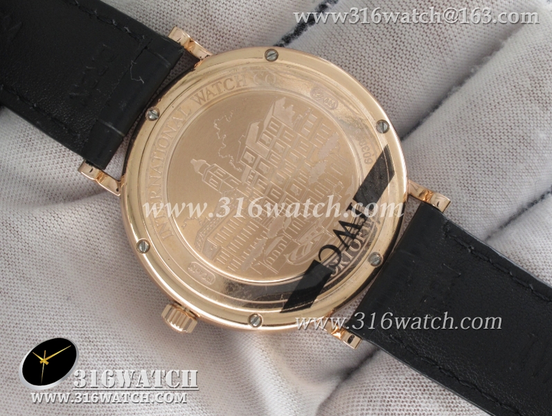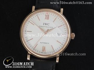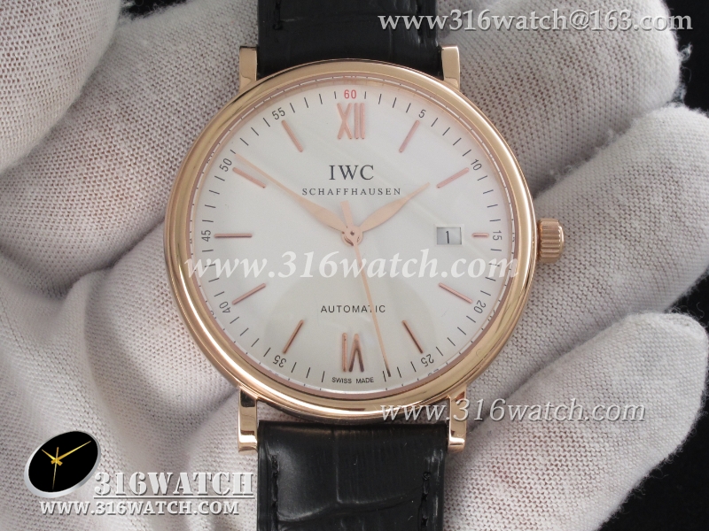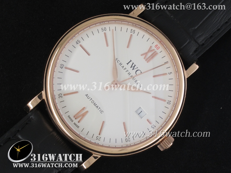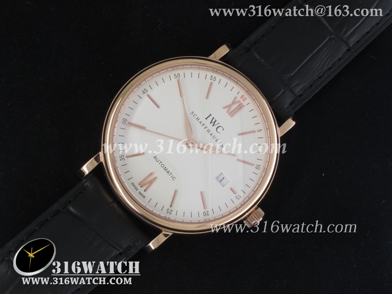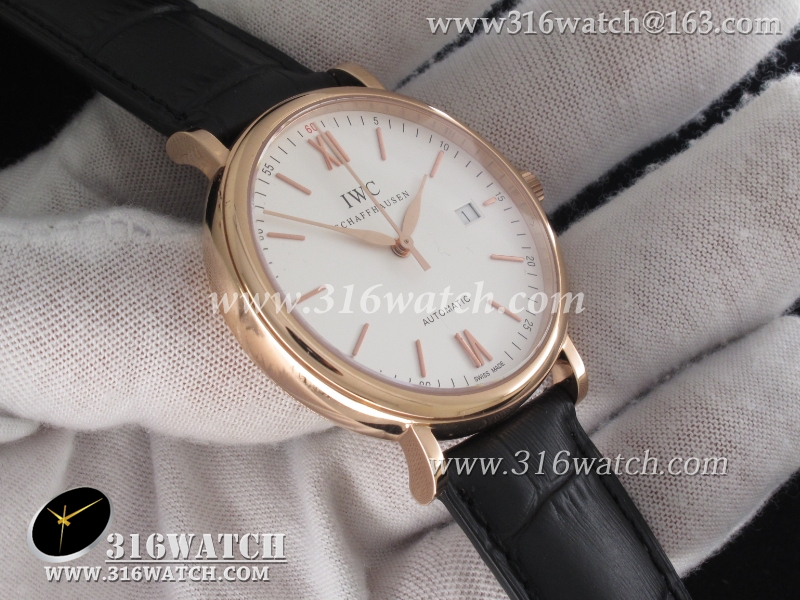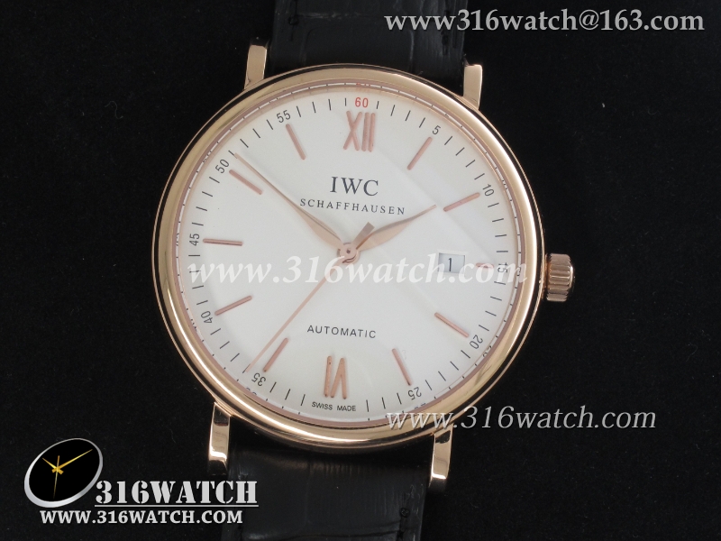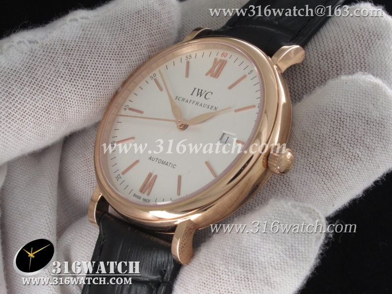 万国IWC-柏涛菲诺系列 18k玫瑰金电镀表壳 白色表盘 黑色牛皮带 仿瑞士ETA-2892机芯高仿1:1万国手表 IWC0091
