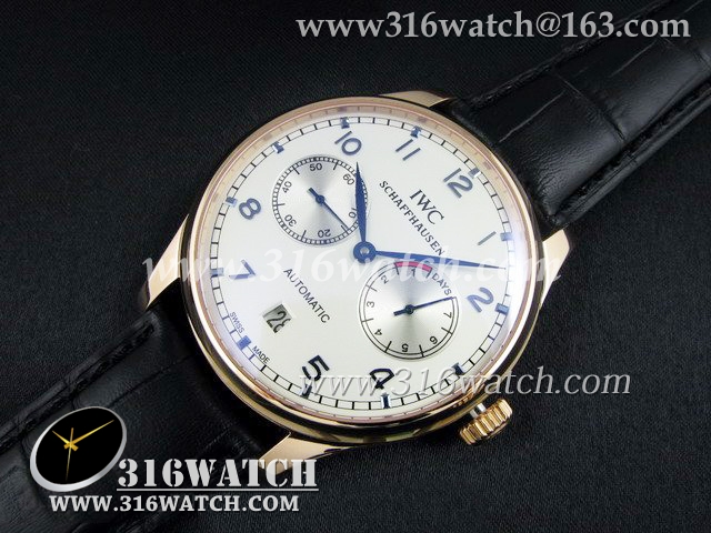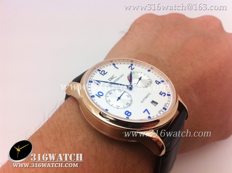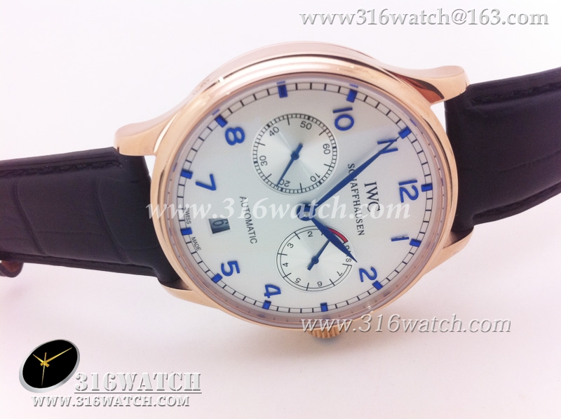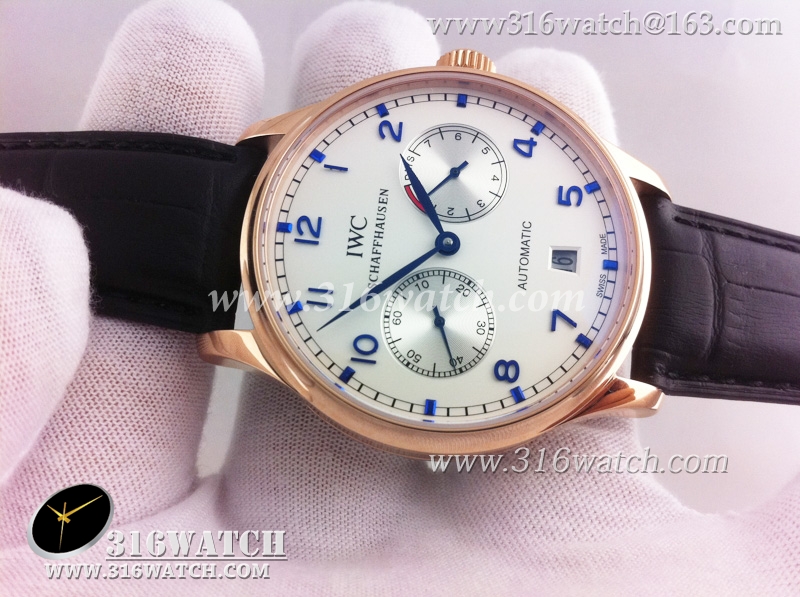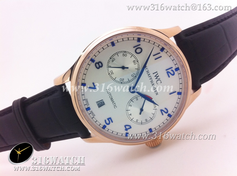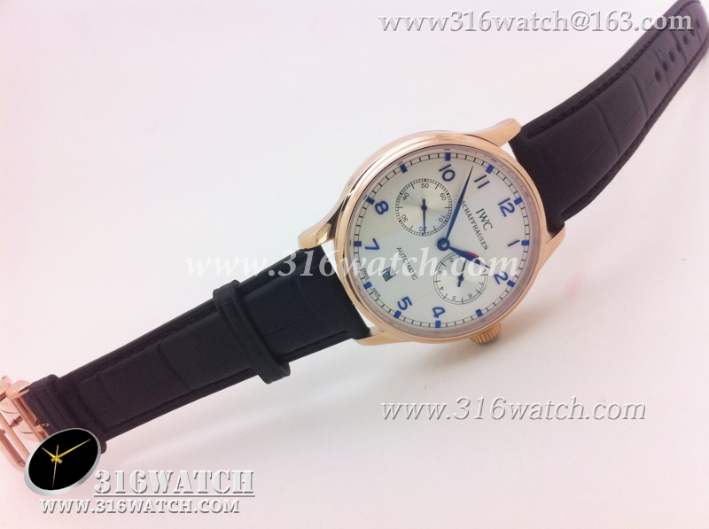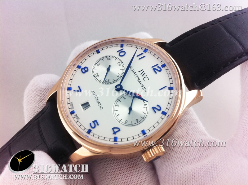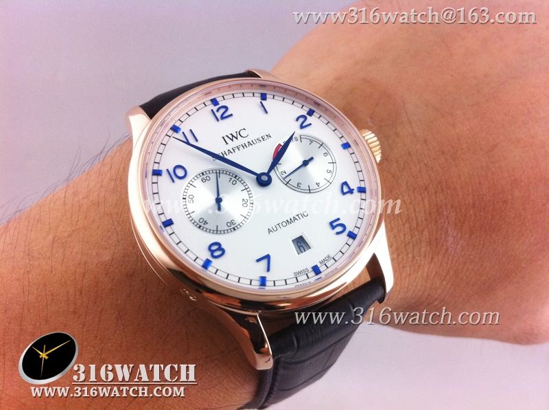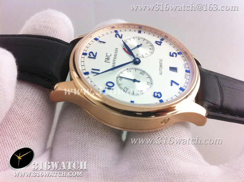 万国IWC-葡萄牙系列 7 DAYS 动能显示18k玫瑰金镀表壳白面蓝字表盘男士自动机械表高仿万国1 :1 IWC0073