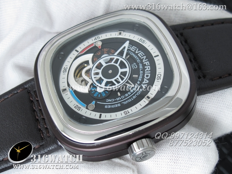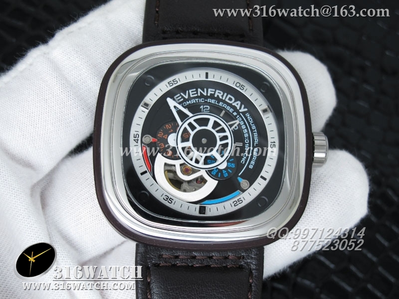 Sevenfriday 手表 1:1 KW PVD电镀不锈钢表壳 不锈钢表圈 黑/白色表盘 黑色小牛皮表带 日本西铁城82S7自动机械机芯 SF009