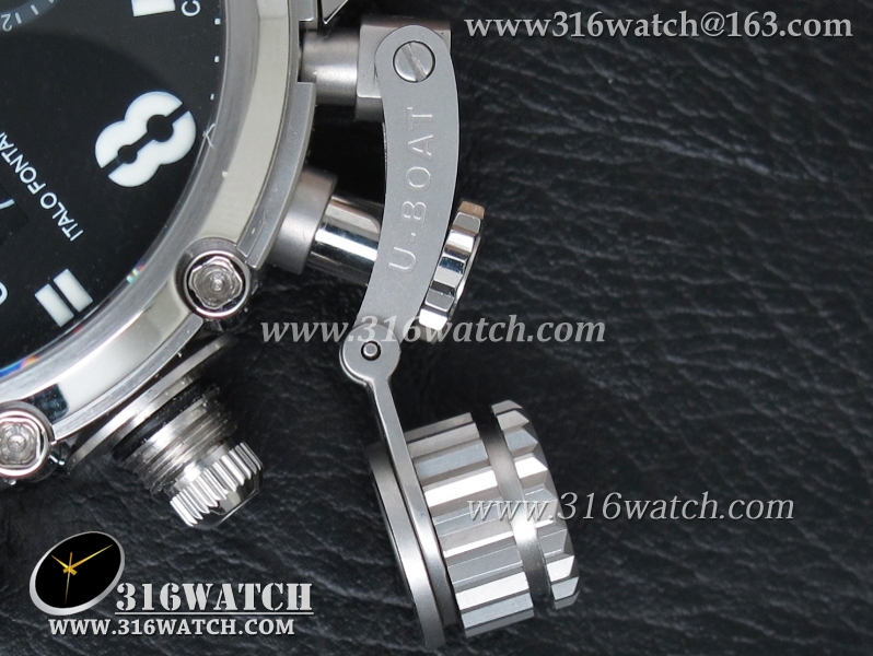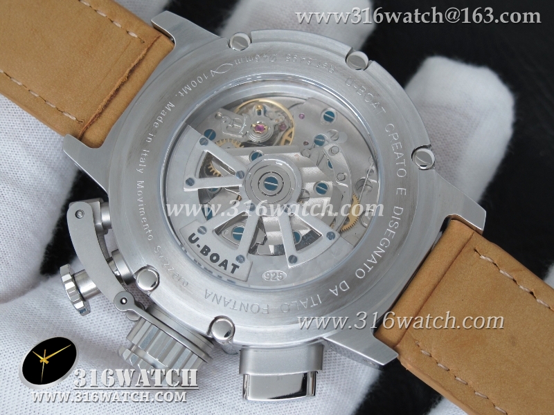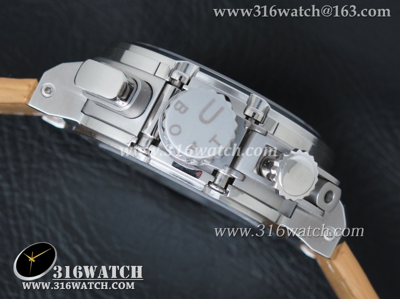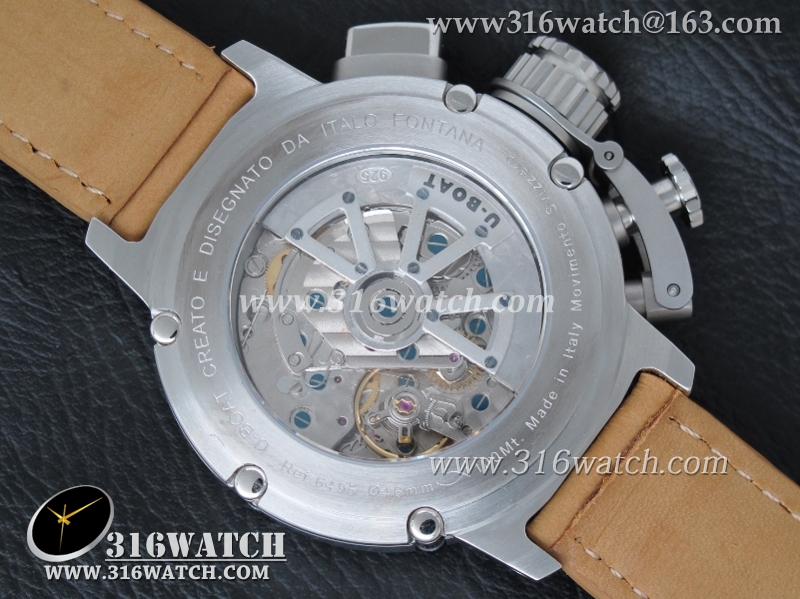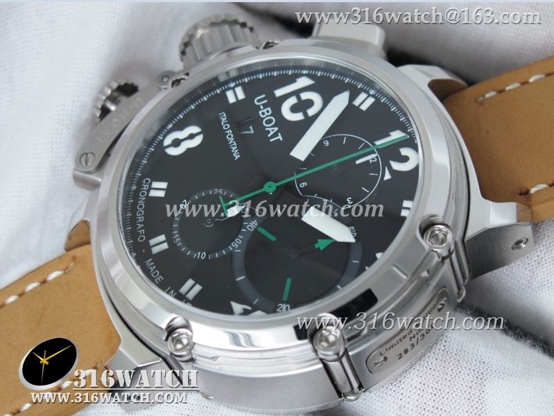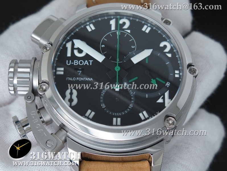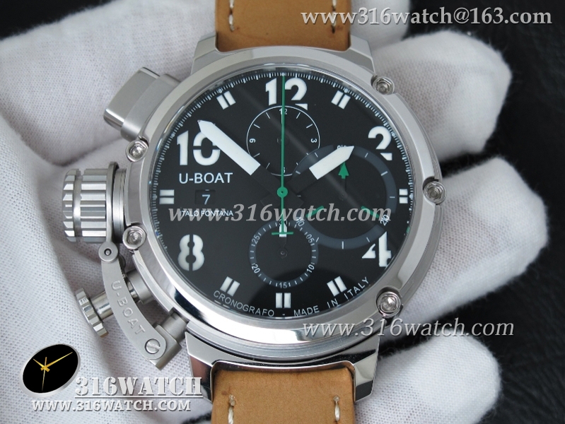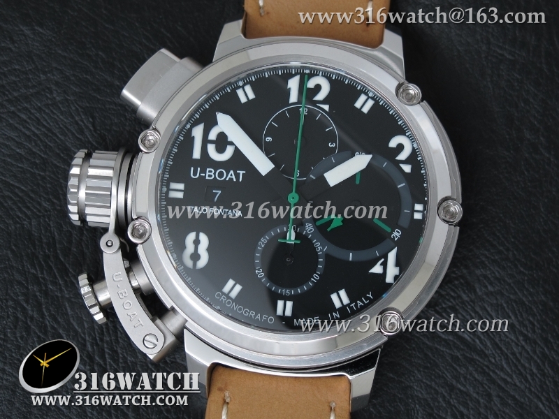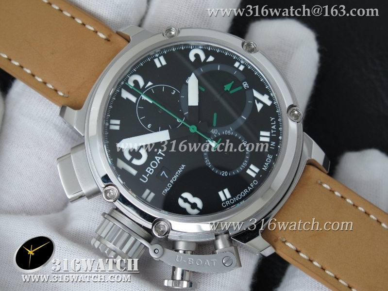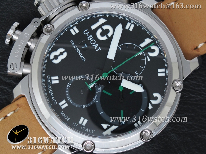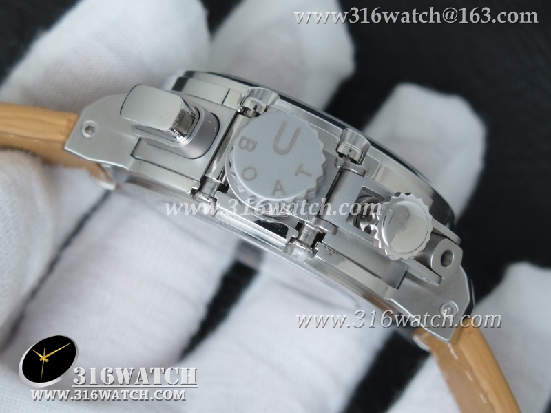 当前位置:高仿手表 > U-BOAT 优博 > U-BOAT优博 U-51 Chimera限量腕表 46mm 黑色表盘 棕色小皮带 计时A7750机芯 UB0001