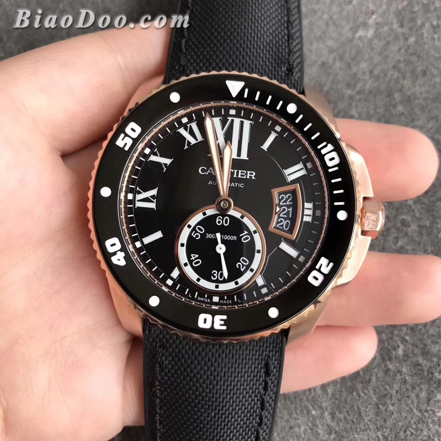 【TF厂出品】卡地亚卡利博潜水系列金壳尼龙面胶带一比一精仿手錶,日历和正品完全一致,錶壳直径42毫米,手錶厚度11毫米,海鸥自动机械机芯,316精钢材质錶壳,陶瓷外圈,蓝宝石水晶玻璃镜面,针扣,防水大于50米。
