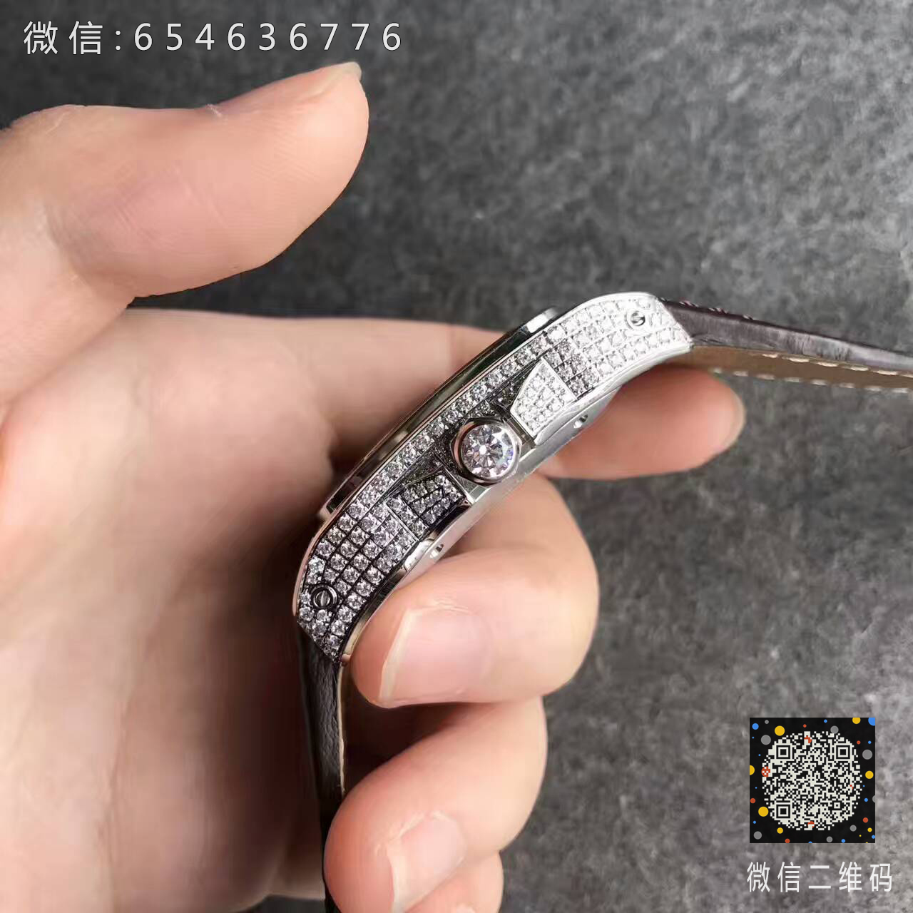 【V6厂出品】男款卡地亚山度士中号满钻,白富美专属,全市场最好版本,直径44.2毫米x35.6毫米,厚度10.7毫米,西铁城自动机械机芯,316精钢材质錶壳镶嵌施华洛世奇水钻,蓝宝石水晶镜面,牛皮錶带,双按钮蝴蝶扣,防水50米。