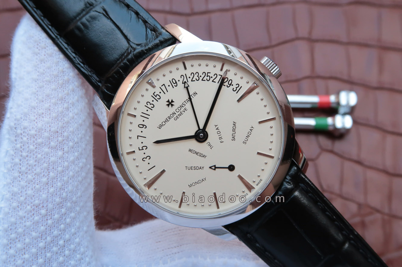 江诗丹顿传承系列86020/000p-9345男士自动机械精仿手錶,PATRIMONY双飞返星期日历系列,42.5毫米直径,克隆原版CaI.2460R31 R7自动机械机芯,进口意大利牛皮錶带,防水深度100米,透底。