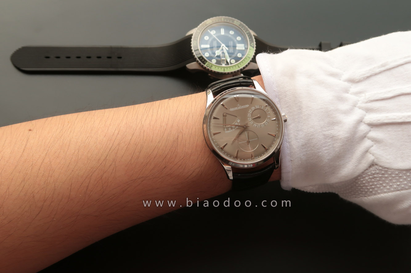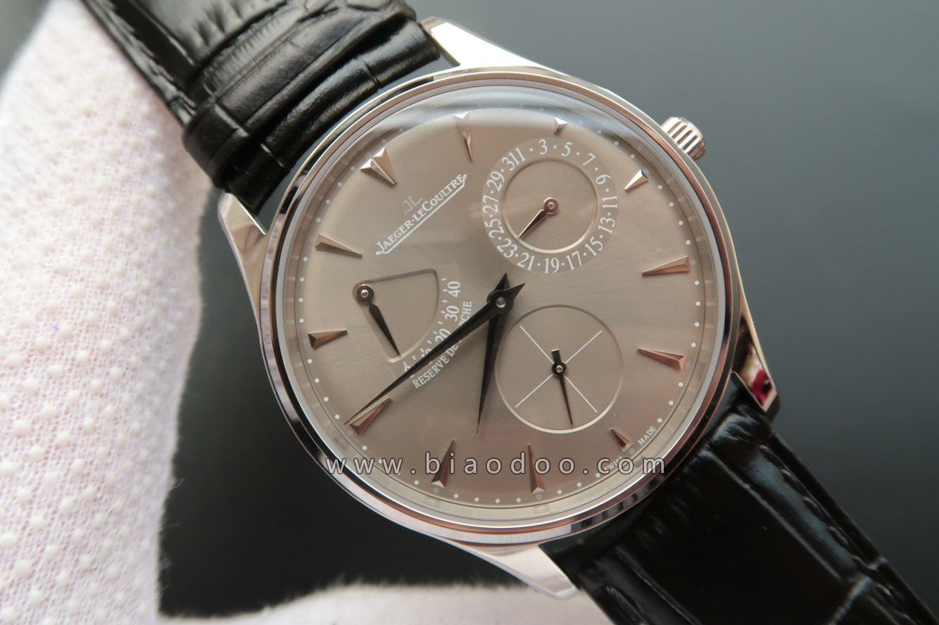 积家终极V5版Q1372501小丑灰面限量版版本,克隆原版938机芯,动能显示的0对准了字母R,和原装字面一样,和正品指针一样指针为一半抛光一半喷砂,牛皮錶带,透底。