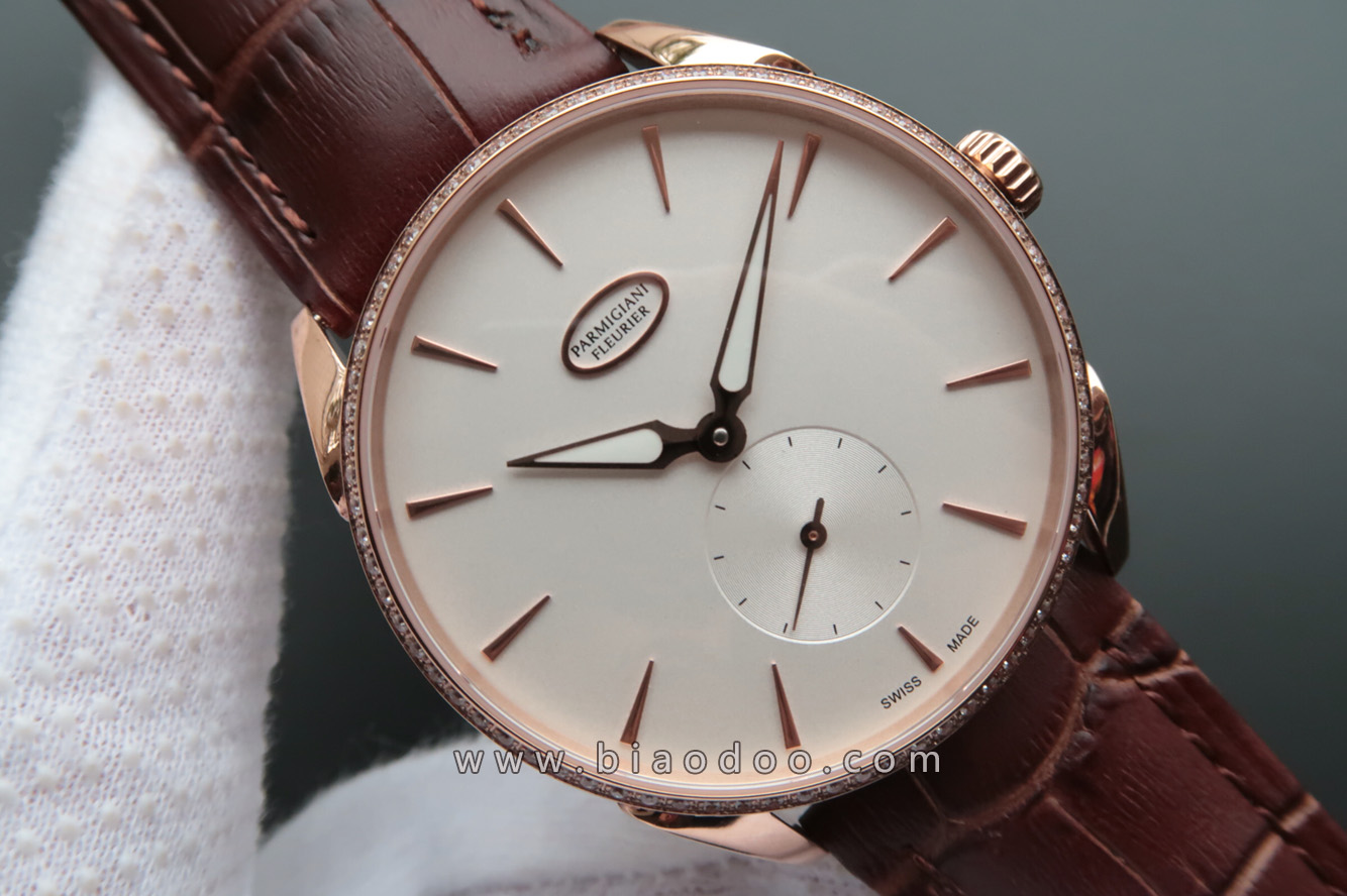 帕玛强尼Parmigiani Tonda系列PFC267男士上链机械手錶,海鸥克隆正品PF701手动上链机械机芯,进口316L精钢材质錶壳镀18k金,振频21600每小时振荡次数,錶径39毫米,厚度7.8毫米,牛皮錶带,透底,防水100米。