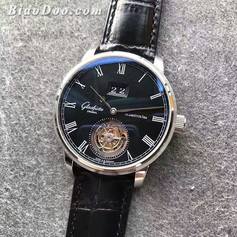 2017巴塞尔錶展格拉苏蒂新款原创议员陀飞轮黑面一比一精仿手錶,手錶直径为42毫米,手錶厚度为14毫米,自动陀飞轮机械机芯,316精钢材质錶壳,蓝宝石水晶玻璃镜面,牛皮材质錶带,折叠式錶扣,防水30米。