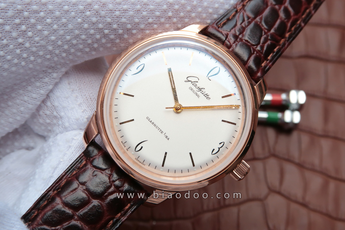 格拉苏蒂原创1-39-52-01-01-04男士自动机械精仿手錶,采用稳定性超强的进口9015改原装cal.39自动机械机芯,20世纪复古系列,39毫米直径,厚度9.4毫米,精钢材质,牛皮錶带,透底,镀银錶盘,镶有夜光材质(Super-LumiNova)玫瑰金指针,原装双面拱形蓝宝石錶镜,防水100米。