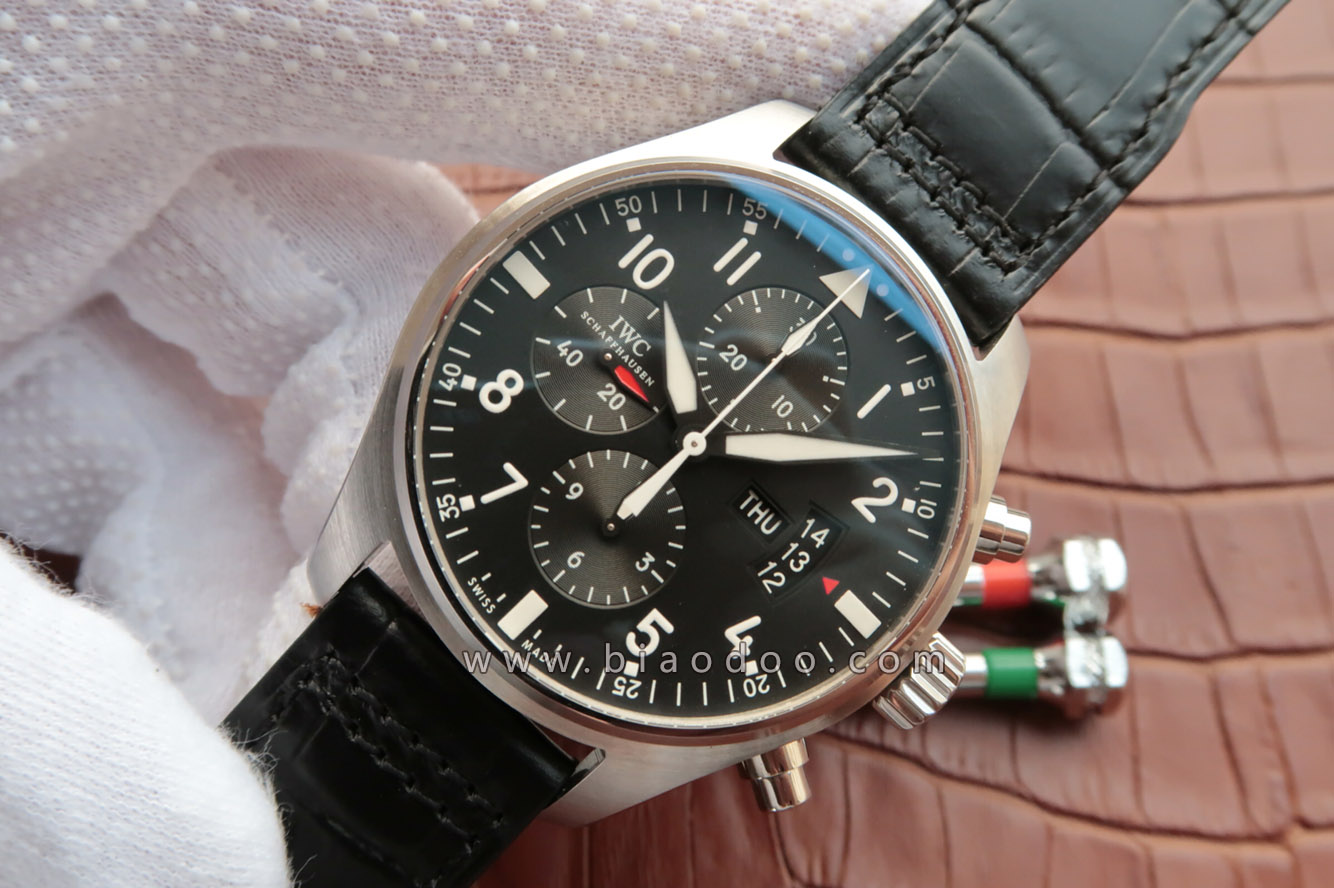 万国IWC飞行员系列IW377701男士自动机械精仿手錶,7750机械自动机芯,蓝宝石+蓝膜,43毫米直径,精钢外壳,密底,小牛皮錶带。