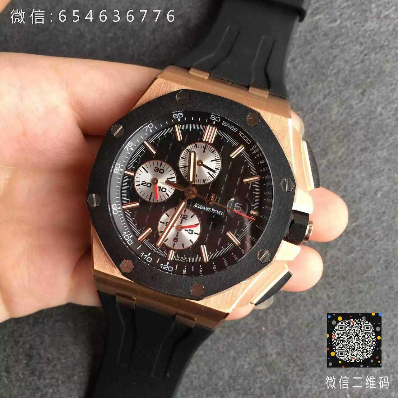 【N厂出品】N厂新版爱彼AP皇家橡树离岸型26400大熊猫玫金壳一比一版本,直径44毫米,厚度15毫米,改3126自动计时机械机芯,316精钢材质錶壳,陶瓷錶圈,蓝宝石水晶玻璃镜面,橡胶錶带,针扣,防水50米。